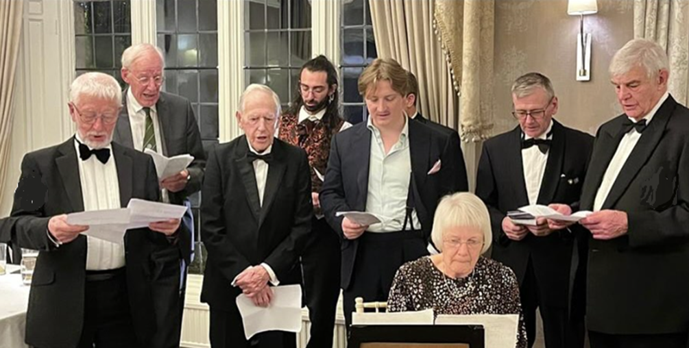 After the meal, the singing of Yorkshire was led by the ‘choir’ of Peters Baker and Chadwick, Trevor, Nick, Conrad Salmon, Malcolm (hidden), Knut, and David Hick, accompanied by Helen at the keyboard. Other members and guests joined in for each chorus and gave an especially rousing last one before the final toast to ‘Yorkshire.’