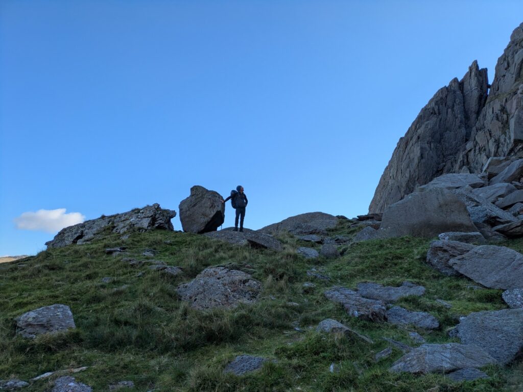 Ian walked up to Glyder Fawr from Pen y Pass then traversed Glyder Fach, descending to Pen y Gwryd via the Miners’ track. He caught a bus back to Pen y Pass to shorten the journey home.
